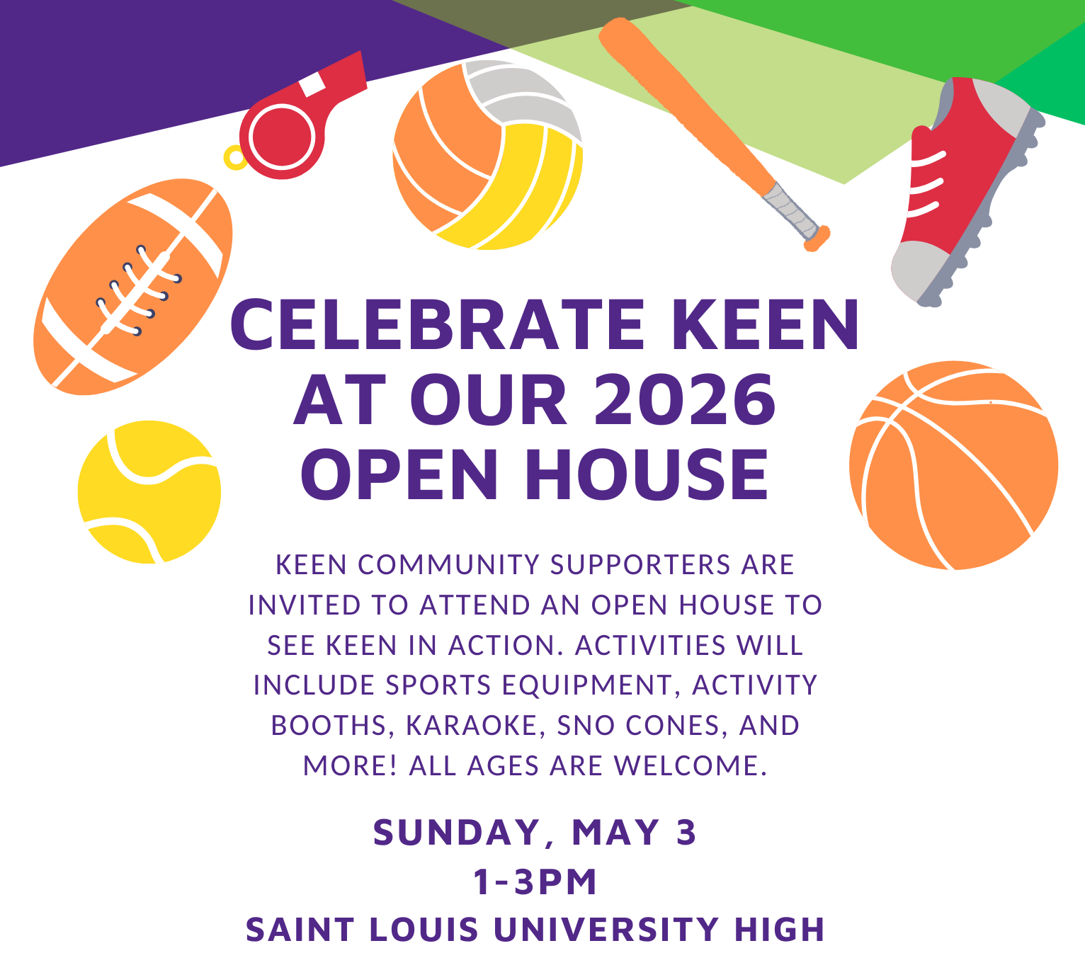 Celebrate our incredible community at KEEN's Open House. In addition to the usual sports fun, we will have activity booths, karaoke, sno cones, and more! All KEEN families, volunteers, and community supporters are invited to participate in the fun. This is a great chance for the St. Louis community to see KEEN in action.